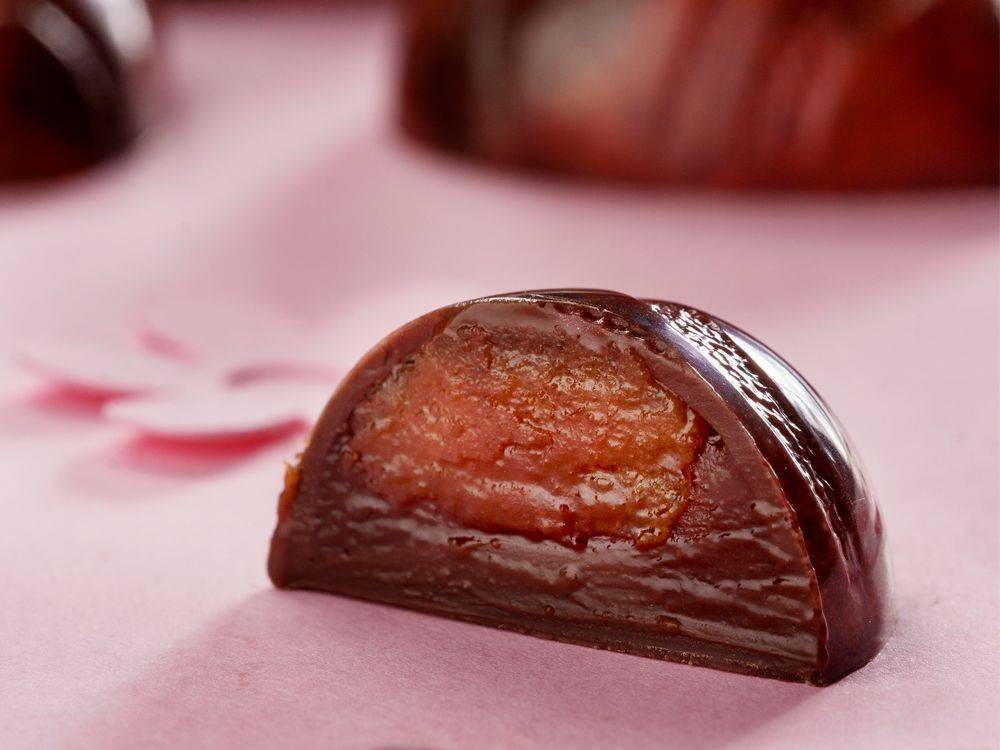 Nach vollständiger Kristallisation der Hülle das Marzipan bis zur Hälfte einfüllen und darauf die Ganache geben. Dabei Platz zum Deckeln lassen und verschliessen sobald die Ganache angezogen hat.