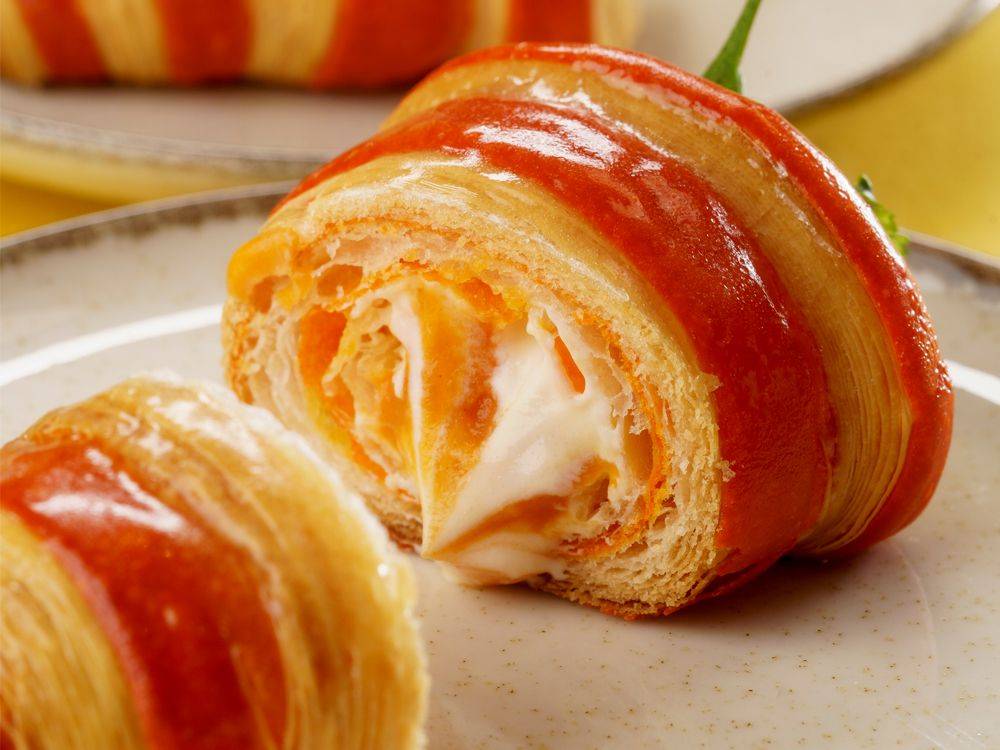 Ein farbenfrohes Croissant mit spektakulärem Glanzfinish. Die luftige, knusprige Teigschicht wird durch eine farbige Platte veredelt. Gefüllt mit einer cremigen Frischkäse-Gewürzmischung und dekoriert mit „Karottenblättern“ aus gefärbter weißer Schokolade. Eine festliche Kreation, die Technik, Ästhetik und feinen Geschmack vereint.