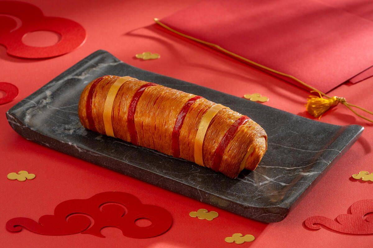 This eye‑catching pastry features a meticulously laminated dough with striking red accents that create a dragon‑scale effect once rolled. The dough is layered, rested, and cut into thin decorative strips before being wrapped around a flavourful pumpkin‑seed chocolate stick. The filling combines CARMA® Dark Padera 55%, pumpkin‑seed praline, Sichuan pepper and crunchy pumpkin seeds for a spicy, nutty bite with a subtle roasted aroma. Once baked, the rolls are finished with a dusting of milk powder that melts into a glossy sheen. A bold, modern viennoiserie that blends colour, texture, and flavour in every bite.